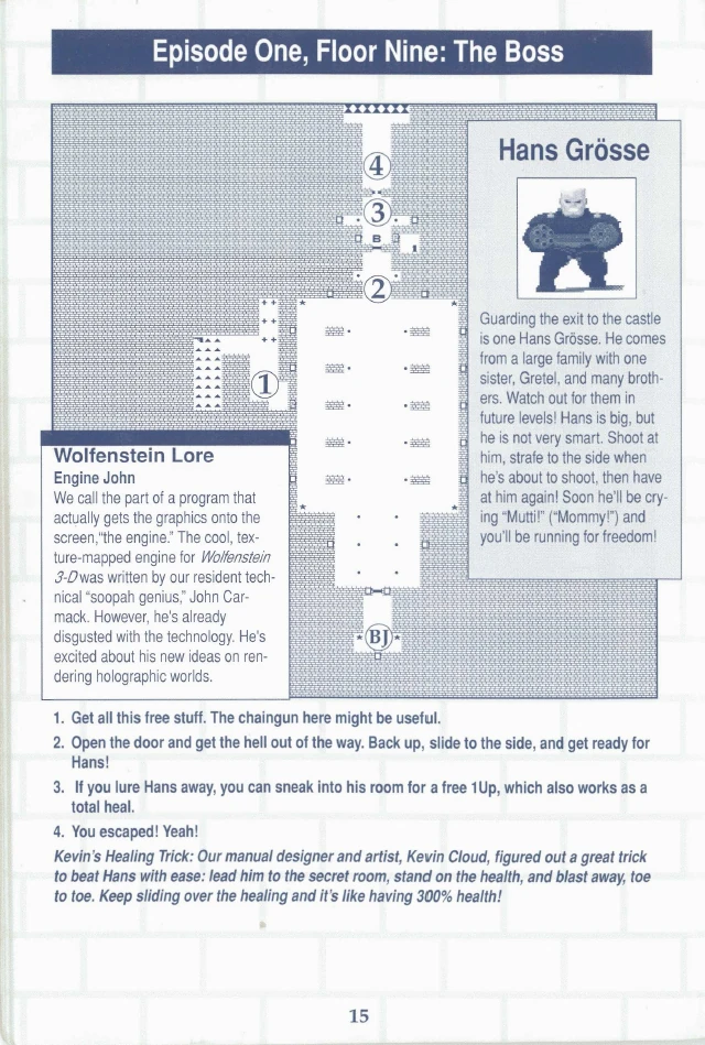 E1M9 is the ninth map in Wolfenstein 3D, the ninth and final map in Shareware Wolfenstein 3D, and the ninth and final map in Episode 1: Escape from Castle Wolfenstein.